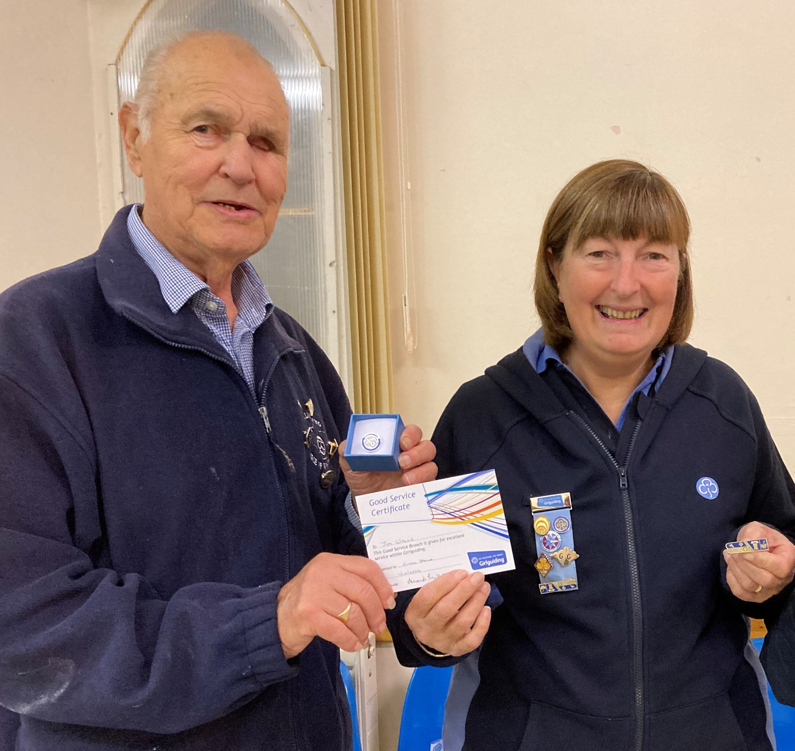 A ‘Good Service’ Award was given to Jim Walls of Ryde for his contribution to Girlguiding over decades. As he was unable to attend this event so Jim was presented with his Award at a unit meeting- (Picture below).