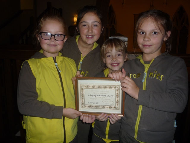 On the actual Birthday-9th November- all the Brownies, their leaders and friends of the unit returned to their old home in St. James’ Street-the much altered church and hall, now ‘The Man in the Moon’ where they enjoyed a meal. Managers of the Wetherspoon’s pub, James Ilott and Myles McNally(pictured at top of item with the Brownies) were pleased to join the group for a photo and to learn the history of the Brownies meeting place.