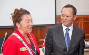 The Chair of the Isle of Wight Council, Lora Peacey-Wilcox, greeted the Mayor of Enshi Su Yong (pictured above) and other Chinese officials at a civic reception in County Hall.