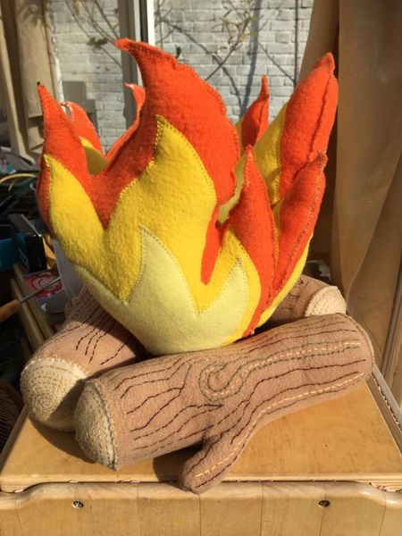 After looking for patterns I could not find any, so I created my own pattern- this took me a while. I decided on the materials to use- fleece and felt. The Flames needed something to bring them alight. I used a gold sparkly thread to do a zigzag stich, giving them a bit of sparkle before they were stuffed. The logs were tricky to do. Firstly, I thought real logs would look best and would be easy. It would be finished soon, and we could use it. However, thinking back to the lovely fire I had seen at the Thinking Day event I decided I needed to make my own logs to get it just how I wanted. This meant I needed to make another pattern. I found some fleece the colour I wanted and spent some time debating if I should make the logs black as though they were on fire. Black logs did not look right, so my fire has that ‘just lit’ look.