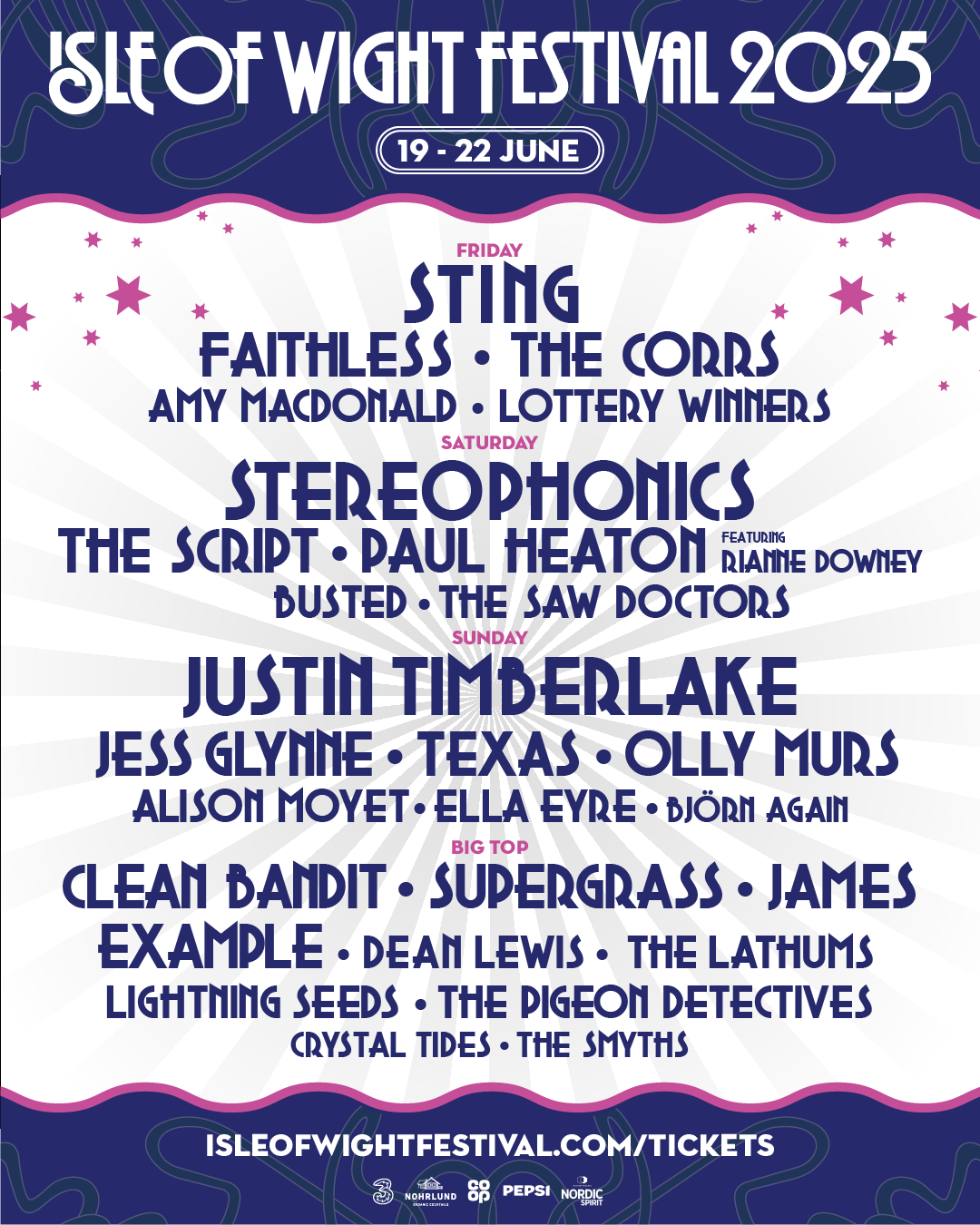 A host of artistes have been announced for the 2025 Isle of Wight Festival, joining headliners Sting, Stereophonics and Justin Timberlake over 19th – 22nd June. Jess Glynne, Supergrass, The Corrs, Busted, Amy MacDonald, Ella Eyre, Lightning Seeds, The Pigeon Detectives, The Saw Doctors, Björn Again, Crystal Tides and The Smyths join the bill of this iconic festival.