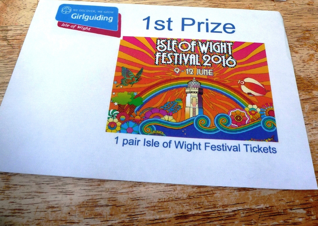 With the first prize of 2 IW Festival Weekend Camping Tickets plus a number of other prizes there was much interest in a Raffle organised by Girlguiding IW. Tickets had been on sale for just a few weeks since Girlguiding IW had been one of ten chosen IW charities to receive the tickets from IW Festival organisers. Over 100 IW charities had applied for the tickets and Lesley Clifford one of the Island Commissioners for Girlguiding commented,” We are very lucky to receive the tickets. They made for a great 1st prize for our raffle and dozens of people have been keen to try and win them.”