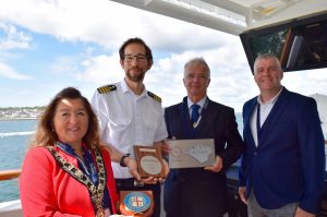 Cowes Harbour Commission held a plaque exchange onboard the Hapag-Lloyd Cruises new ship HANSEATIC Nature to welcome the ship to Cowes. Attending the plaque presentation were the HANSEATIC Nature’s Staff Captain Christoph Kunz, (2nd L) Cowes Harbour Master Capt. Stuart McIntosh,(2nd R) Cowes Mayor Lora Peacey Wilcox, (L) and Chairman of Visit Isle of Wight Ian Griffiths.(R)