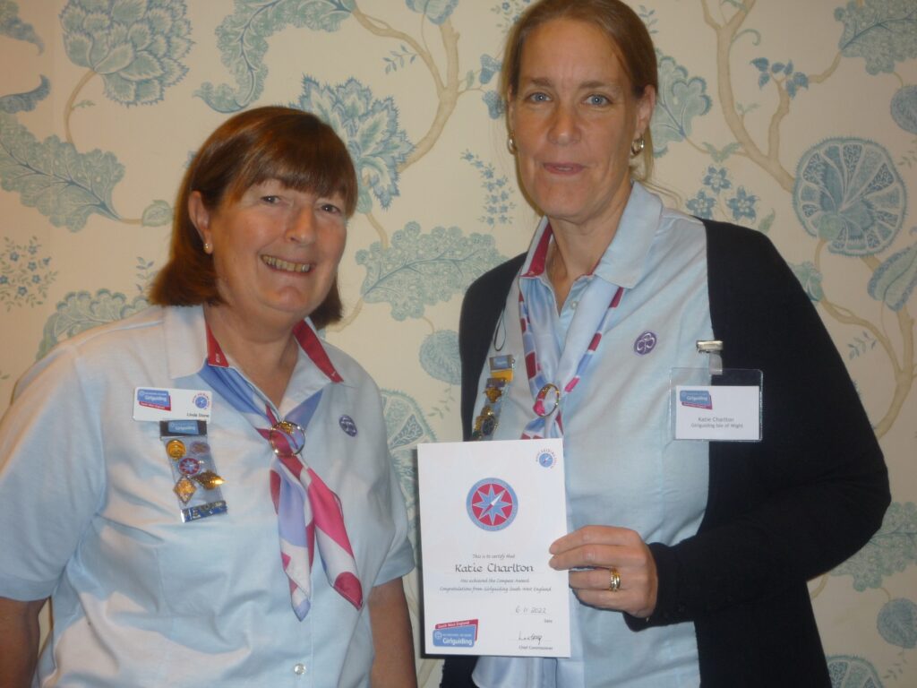 Katie from Newport has been honoured for her work supporting girls and young women for over 20 years with a Region Compass Award. She was proposed for this prestigious discretionary honour by fellow members of Girlguiding IW and presented with her Award, for her inspirational efforts, by Racheal Tattum Deputy Chief Commissioner Girlguiding South-West England at a ceremony in Salisbury.