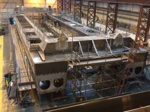 The twin aluminium catamaran hulls are now easily recognisable inside the famous Union Jack branded Columbine building in East Cowes. Shell plating on the twin hulls is complete and welding work is underway in the hull void spaces, bulkheads and double bottoms. Once complete, the fuel and water tanks will be ready for installation.