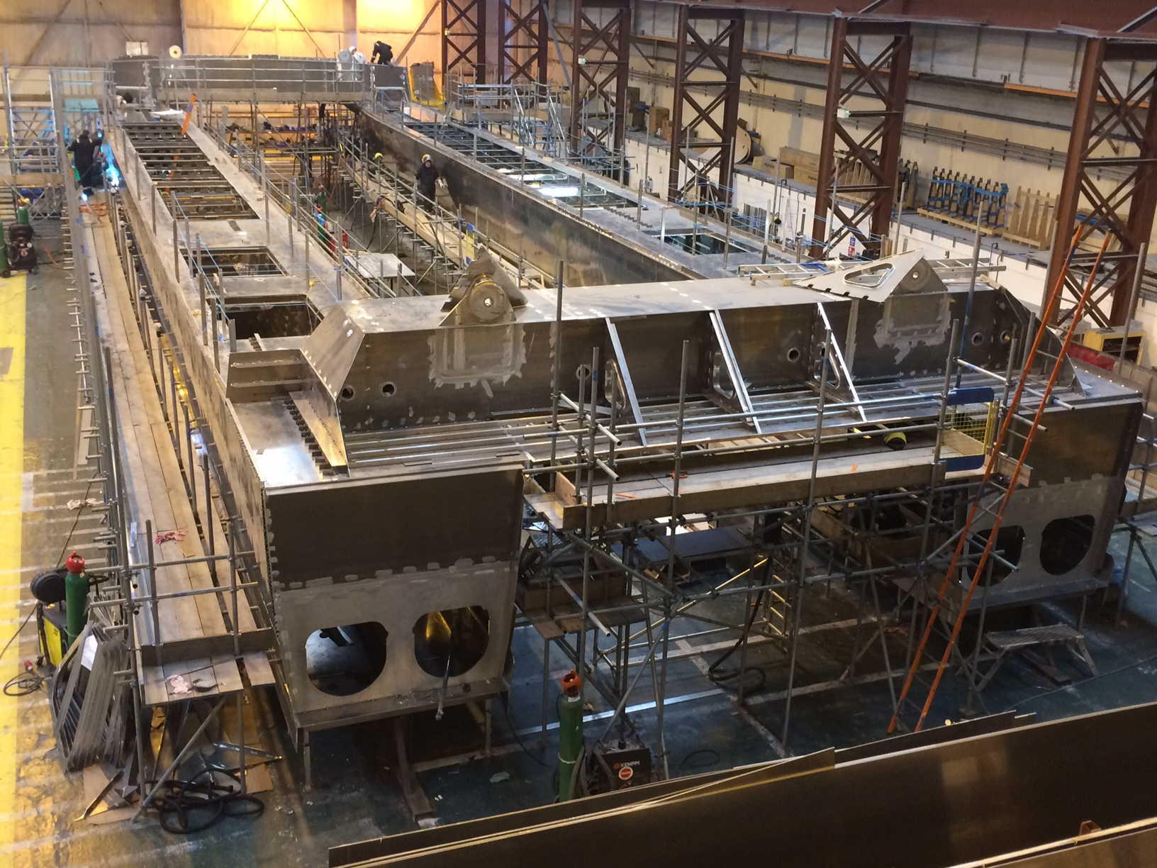 The twin aluminium catamaran hulls are now easily recognisable inside the famous Union Jack branded Columbine building in East Cowes. Shell plating on the twin hulls is complete and welding work is underway in the hull void spaces, bulkheads and double bottoms. Once complete, the fuel and water tanks will be ready for installation.