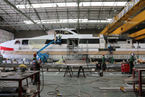Red Jet 7, Red Funnel’s new Hi-Speed passenger ferry, which is under construction by Wight Shipyard in East Cowes, is due to enter the water for the first time at the end of May.