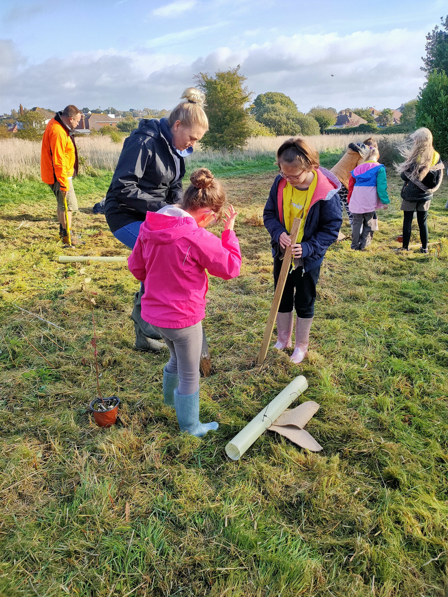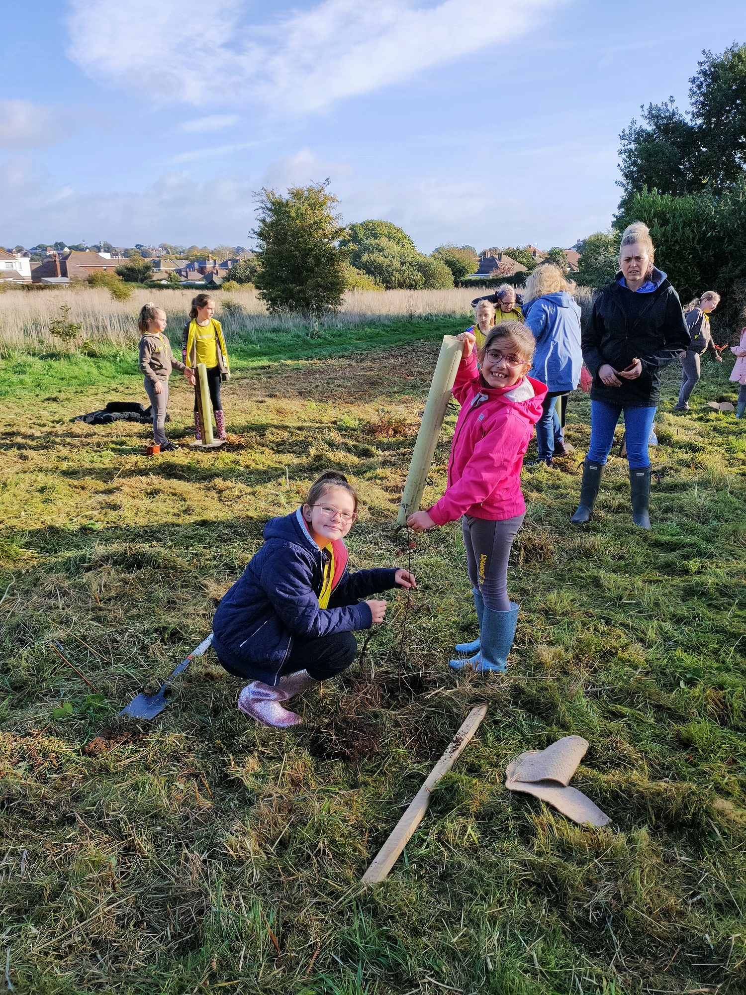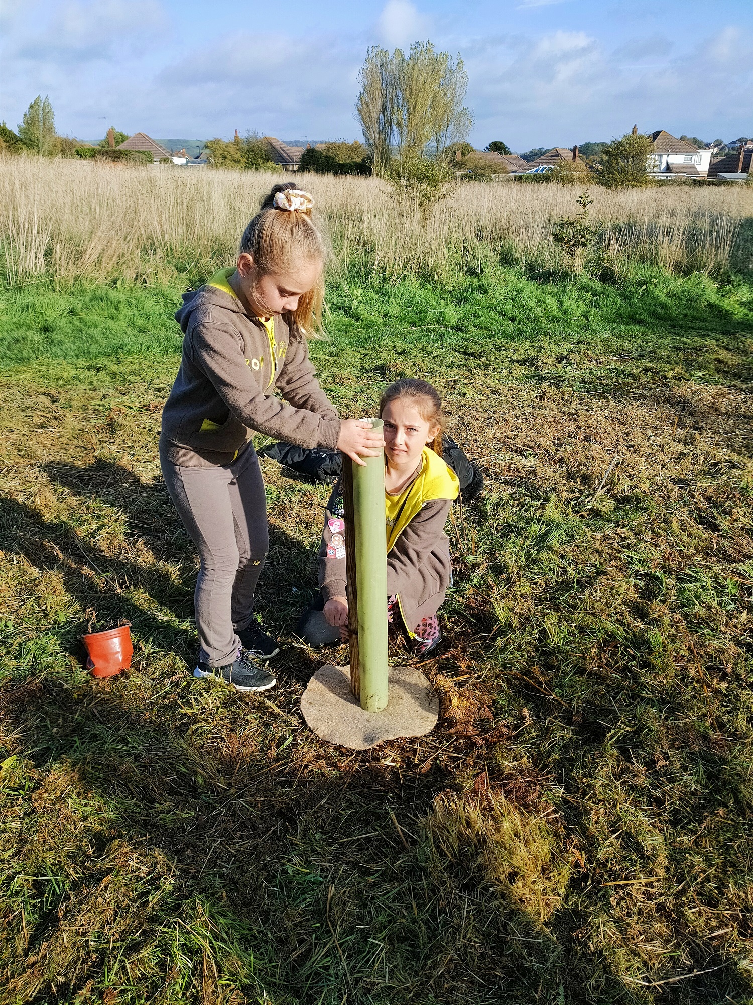 On the following day more trees were planted by 4th Sandown Brownies in conjunction with Natural Enterprise at Copse Mead, Lake with once again Karl and Rachael assisting the Brownies and their leaders with this planting. Here seven trees of the same varieties mentioned above were planted. Brownie Leader Angela Smith said,” When the Queen passed away, King Charles III asked for the planting of The Queen’s Green canopy to continue in her memory. The girls were very involved, digging the holes and planting the trees, putting a composting mat around them, (which gives them nutrients) and then protecting the trees by putting a tube around them. This was followed by Hot Chocolate and a walk around the meadow, with Rachael pointing out all the different trees and bushes. During the walk the Brownies spotted a Field Mouse, a Tiger Moth Caterpillar, Ladybirds and other small insects. “