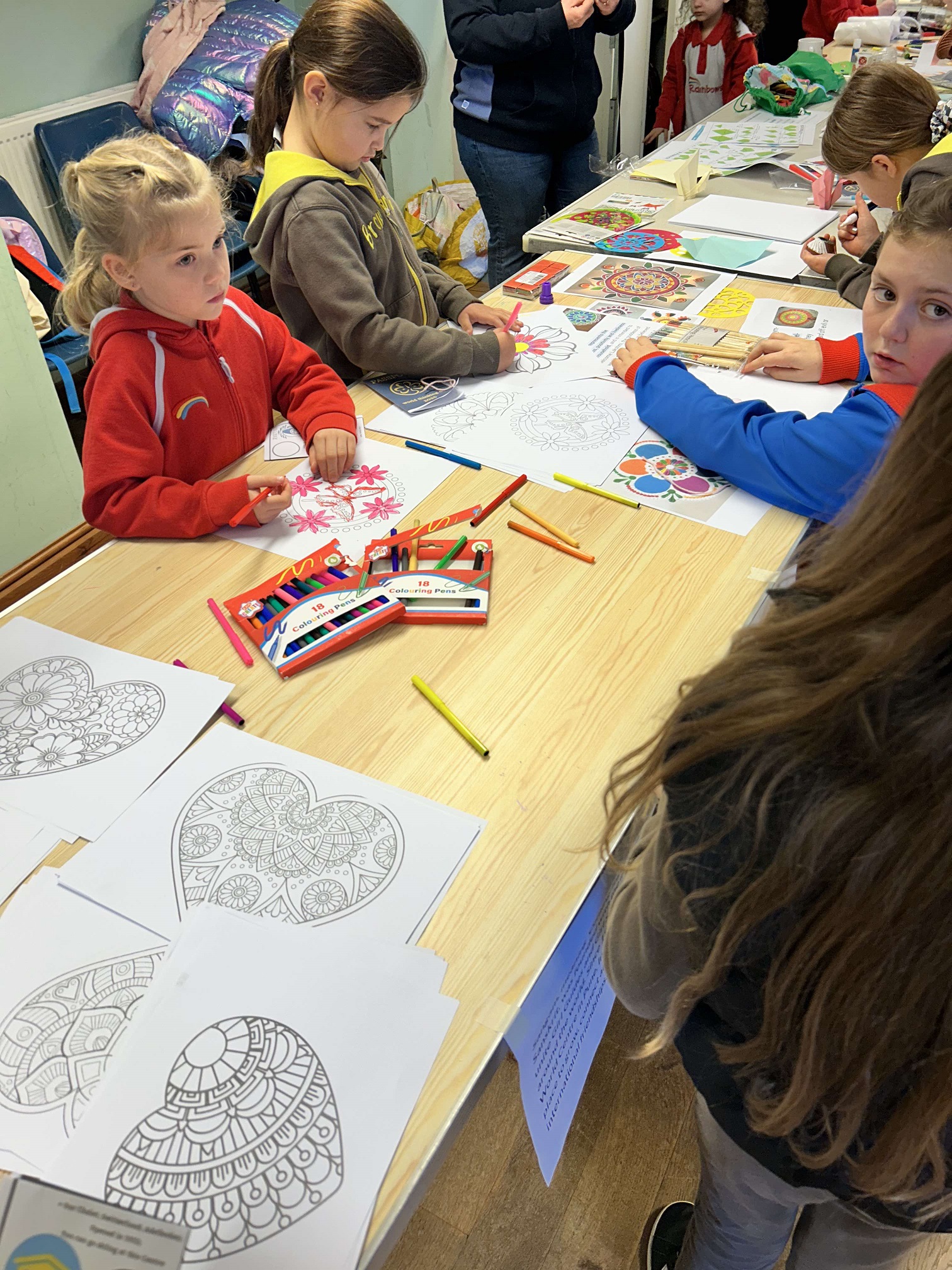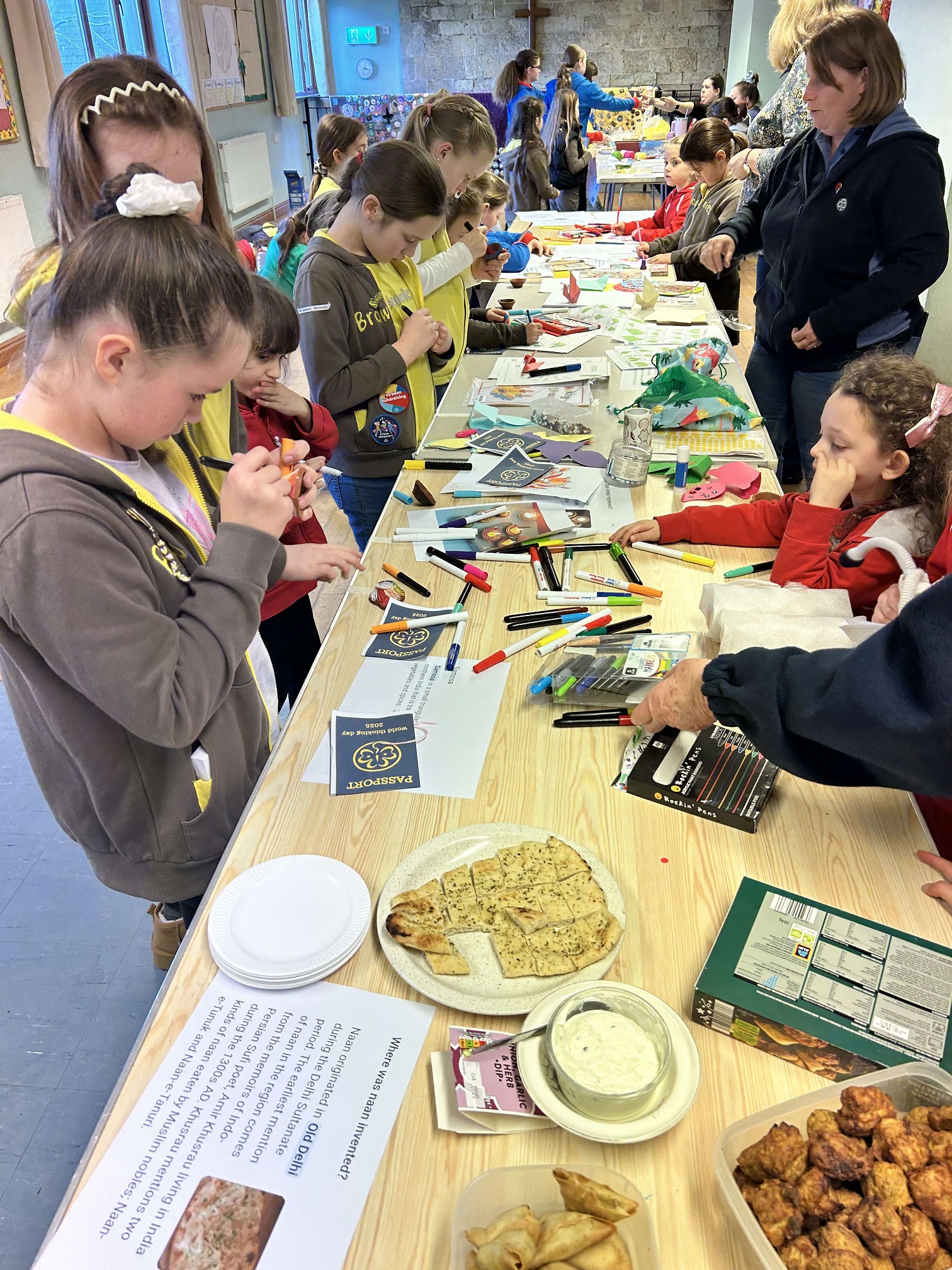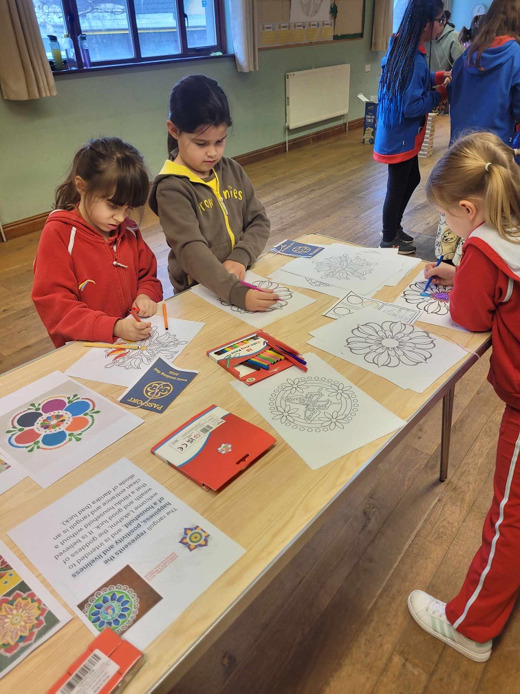 These included Rangoli patterns, 3d peacocks, Origami Peacocks, Diya Paper Lamps, Ceramic Diya Lamps to decorate, Skiers, Paper Snowfights, Wordsearches, Peace Doves, Making London Skylines, Jenga, Thinking Day Cards and Friendship Bracelets. Foods were Cucumber Sandwiches, Victoria Sponge Cake, Samosas, Pakoras, Naan Bread, Swiss Cheese and Swiss Chocolate.